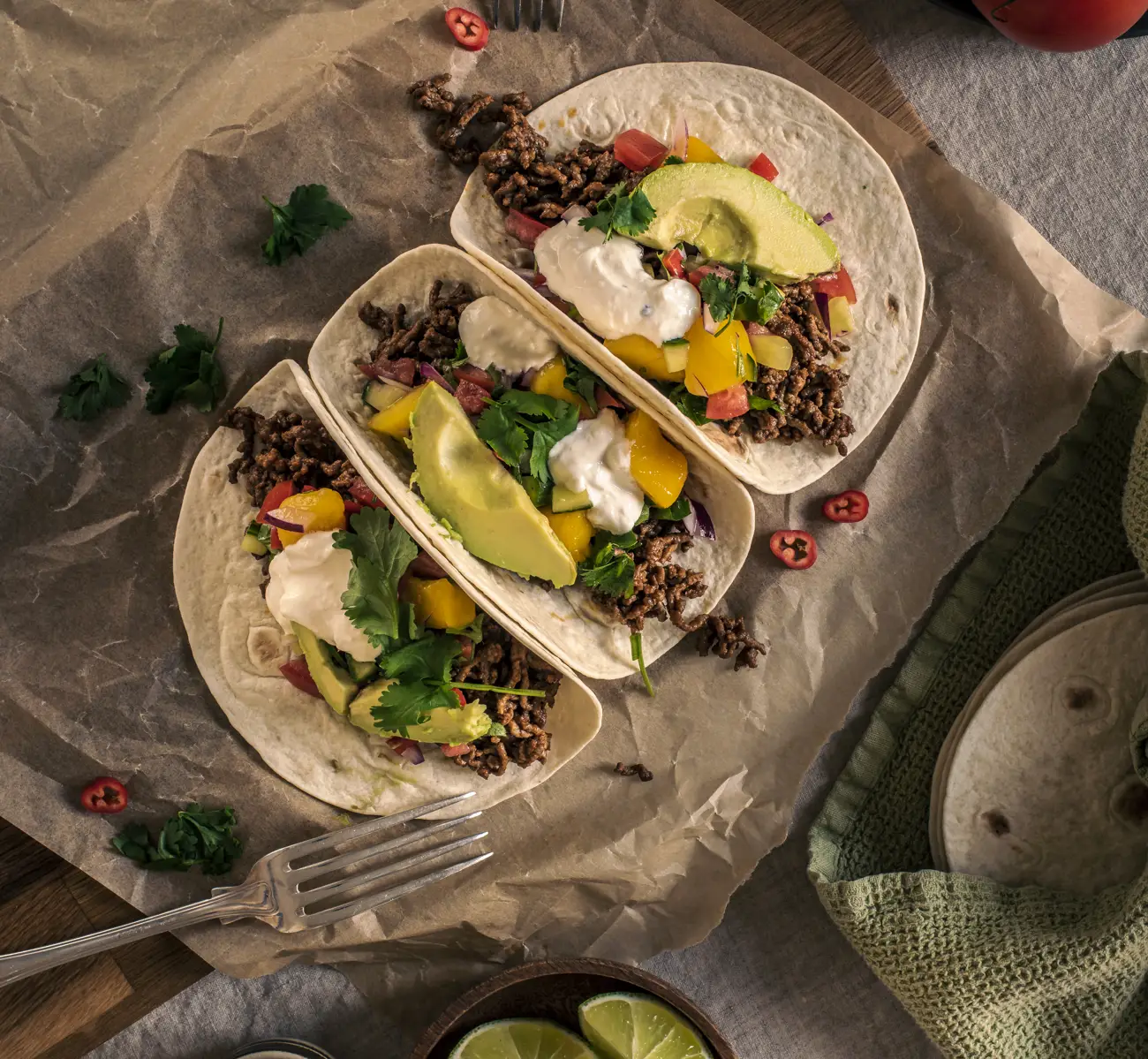 - Stek tortillabröden på högsta värmen i en torr stekpanna i några sekunder till de får lite färg. Lägg på tacofärsen, skivad avokado och mangosalsa. Toppa med crème fraiche vitlök och färsk koriander.