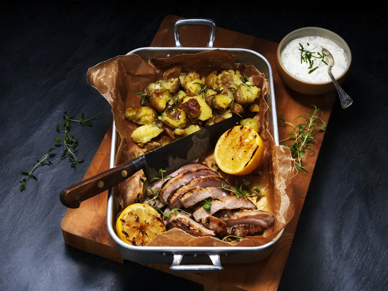 Grillad pluma med ugnsbakad mandelpotatis, grillade citroner och yoghurtsås