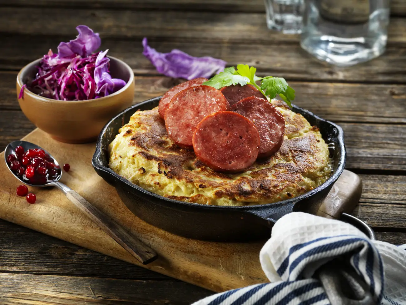 Rör sakta med en plast- eller trästekspade genom att lossa stora sjok av äggsmeten från botten. Samla ihop allt mot mitten och skaka om lite då och då. När äggsmeten börjar stanna är det dags att vända. Vänd den på ett blött grytlock eller – för den vågliga – i luften. Lägg tillbaka äggkakan med den stekta sidan uppåt. Lägg på korven och grädda i ugnen i ca 8 min så att den ”puffar” upp sig. Servera med rårörda lingon och kålsallad.