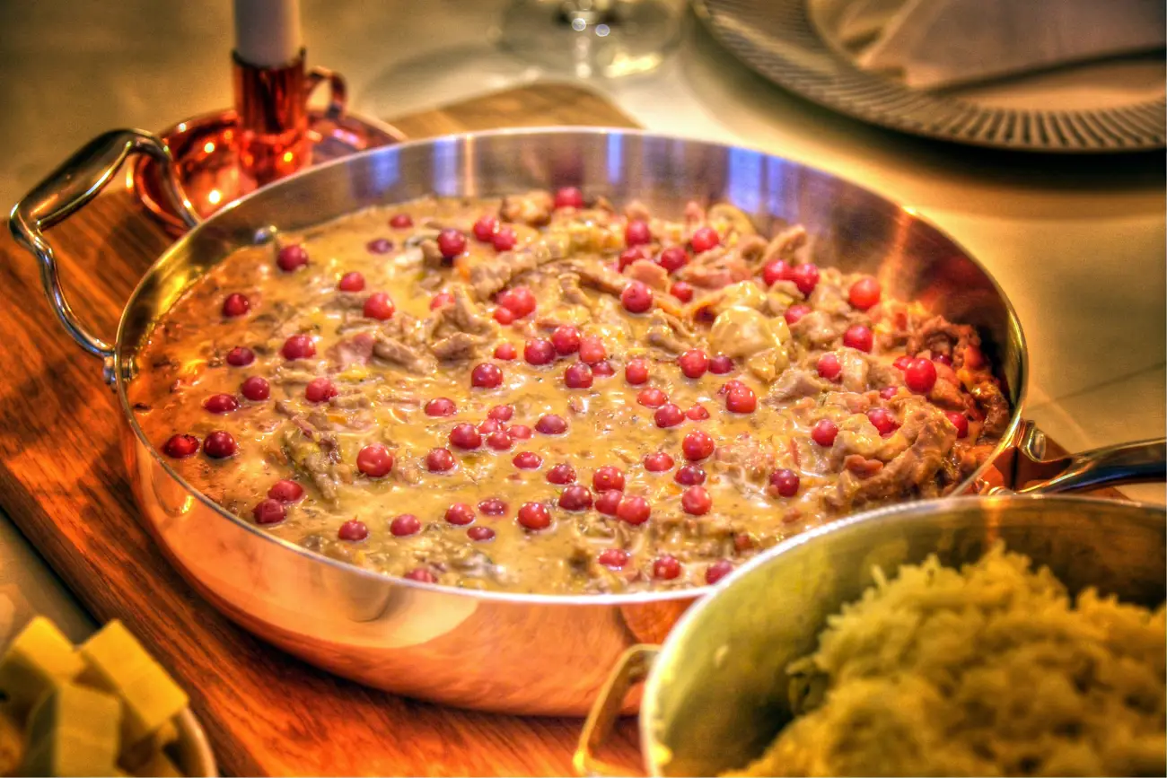 - Servera direkt ur pannan på bordet och dekorera grytan med att strö över resten av lingonen.