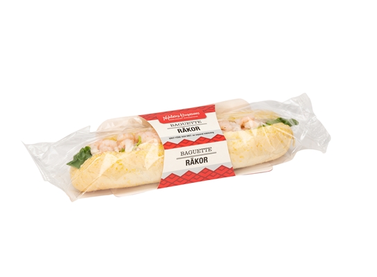 Vetebaguette (50.4%)[VETEMJÖL, vatten, flytande margarin (rapsolja, vatten, härdad rapsolja, salt, emulgeringsmedel (E471), arom, A- och D-vitamin), bakhjälpmedel (VETEGLUTEN, dextros, VETEMJÖL, förtjockningsmedel (E412), emulgeringsmedel (E481, E472e och solroslecitin), vegetabiliskt fett (raps), surdegspulver av VETE), potatisflingor, GLUTEN, druvsocker, jäst, salt, RÅGMALT. Topping: Majsgrits], Skagenröra (36.3%) [Rapsolja, CRABBFISH (24 %)(FISK, vatten, tapiokastärkelse, salt, socker, solrosolja, ÄGGvitepulver, KRABBarom, KRABBextrakt, färgämne (E120, E160c, E170)), vatten, RÄKOR (14 %), STENBITSROM (1.5 %) (med sherry och färgämnen (E160a, E120)), socker, salt, ättiksprit, ÄGGulepulver, dill, SENAPSFRÖ, vinäger, kryddblandning (kryddextrakt, jästextrakt, cayennepeppar, glukossirap, tomatpulver, KRABBextrakt, druvsocker, FISKpulver, aromer), konserveringsmedel (E202, E211), förtjockningsmedel (E415, E1442), surhetsreglerande medel (E330), maltodextrin], Räkor (10.1%) [RÄKOR, vatten, salt, antioxidationsmedel (E330), konserveringsmedel (E211, E202)], Gröna salladsblad.