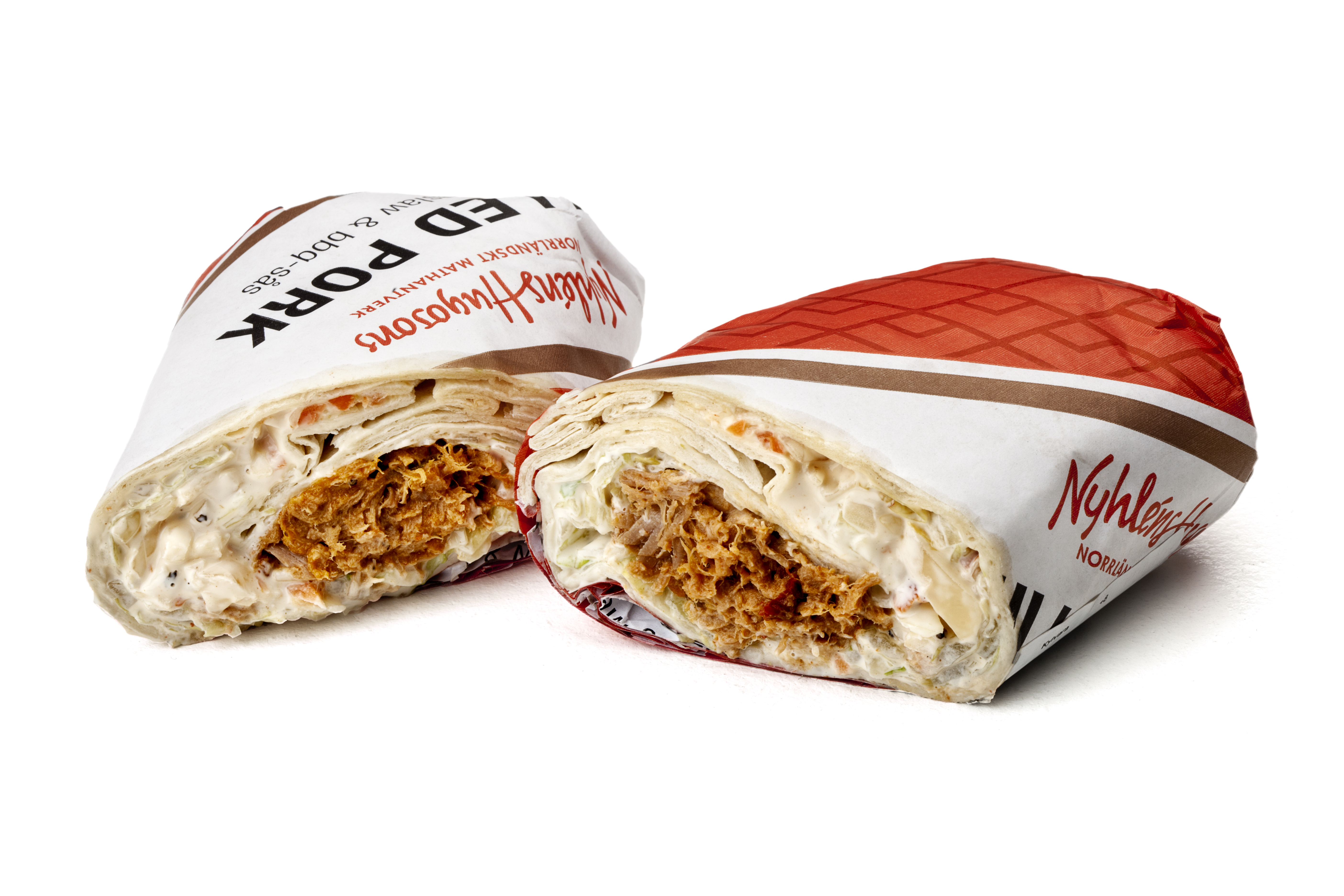 Tortillabröd (31.0%)[VETEMJÖL, vatten, rapsolja, socker, emulgeringsmedel (E471), bakpulver (E500, E450), salt, äppelsyra], Pulled pork (29.0%) [griskött (71%) (vatten, grillkrydda (salt, paprika, druvsocker (majs), socker, majsmjöl, majsgryn, svartpeppar, kryddextrakt (paprika)), salt, konserveringsmedel (E262), chipotlesås (rapsolja, vatten, farinsocker, äppeljuice, lök, ättika, tomat, chipotle (1,5%), salt, rökt paprika, vitlök, sirap, kryddor, kalvfond (vatten, salt, köttextrakt, buljongarom, tomat, kalvbuljong, modifierad stärkelse, syra (mjölksyra), konserveringsmedel (E202)), stabiliseringsmedel (E415), konserveringsmedel (E202), chiliflakes] Coleslaw (20.0%) [Vitkål (41%), rapsolja, vatten, morot (7,2%), socker, ÄGGULA, salt, SENAPSFRÖ, ättiksprit, vinäger, chili, konserveringsmedel (E202, E211), förtjockningsmedel (E412, E415), surhetsreglerande medel (E330), antioxidationsmedel (E300)], Isbergssallad.