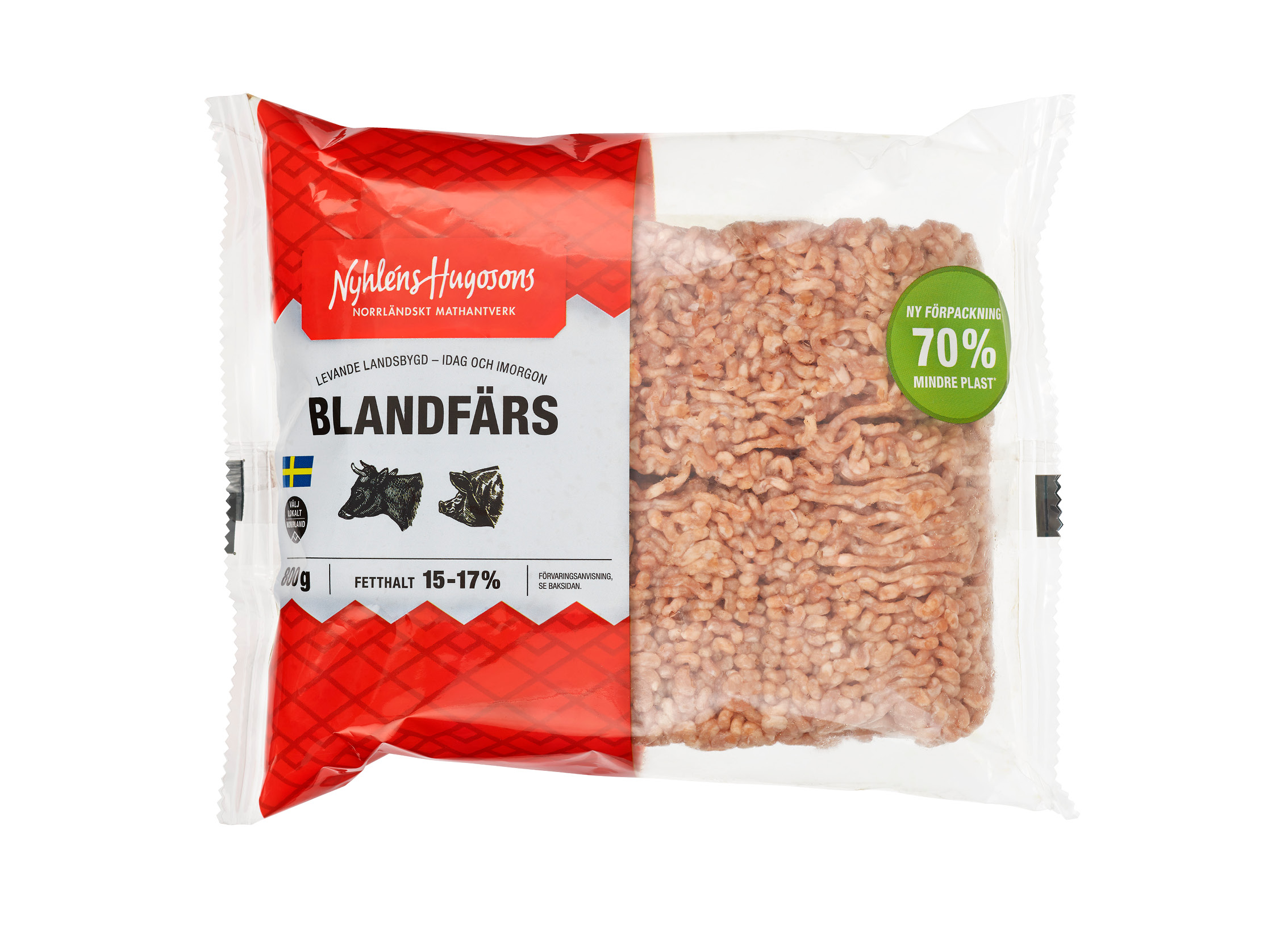 Fetthalt ca 15-17%. Nötkött 50%, Griskött 50%.