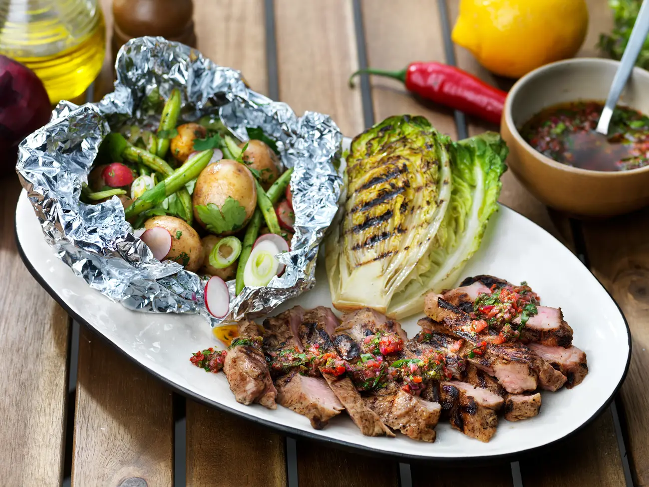 Fläskkarré med bakad färskpotatis, grillad hjärtsallad och chimichurri