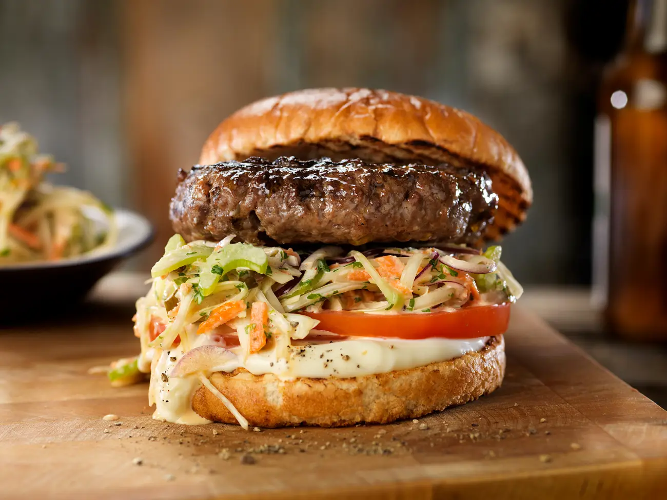 - Montera din salsicciaburgare med coleslaw och en skiva bifftomat.