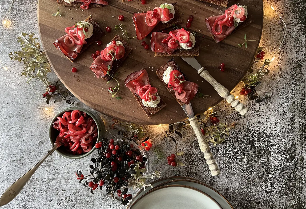 Hamburgerkött med pepparrotsröra på kavring, glöggpicklad rödlök o lingon