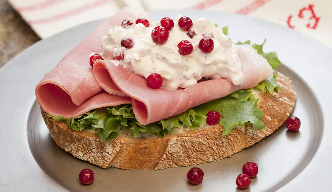 - Blanda lök och äpple med crème fraiche, smaka av med kryddor och senap. Vänd ner lite lingon, var försiktig så de inte går sönder. Toppa med några lingon för syns skull.
