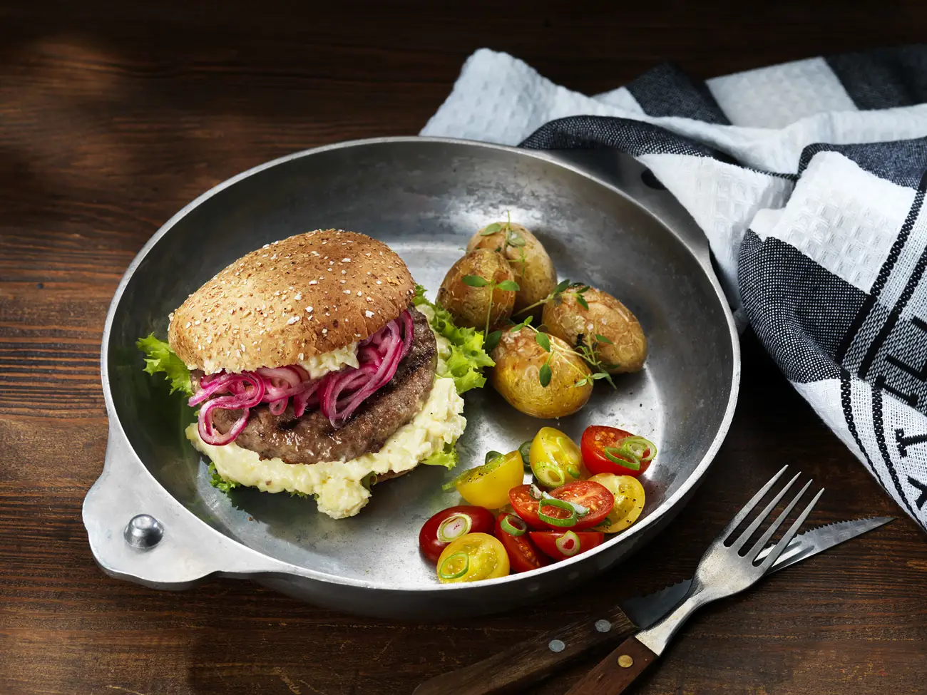Grillad hamburgare med Västerbottensostdressing, picklad rödlök, rostade potatisar