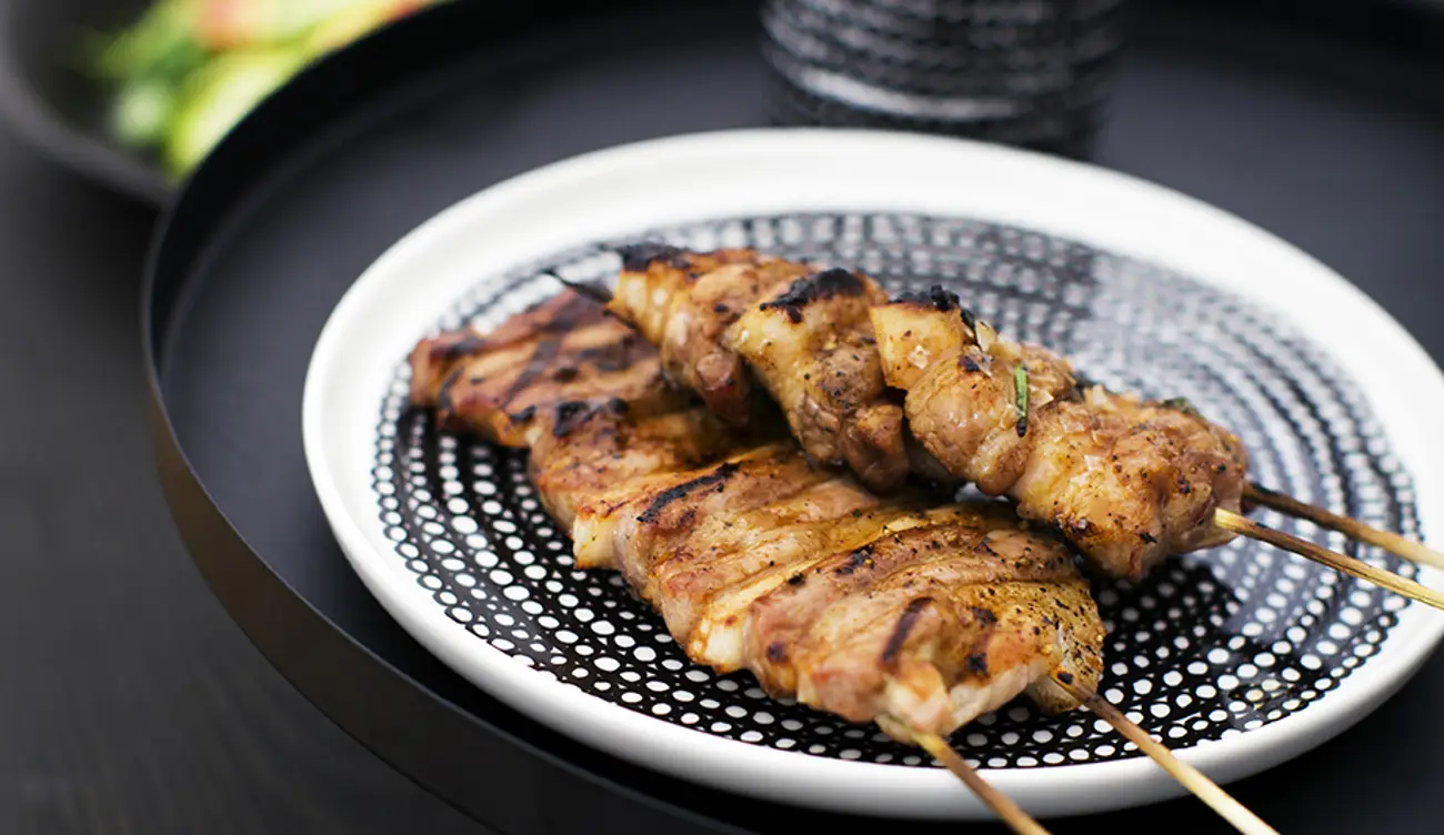 - Skär fläsket i 1 cm tjocka skivor. Trä upp på spett. Blanda marinaden och pensla fläsket. Grilla på utegrill eller i ugnen på 225 °C.