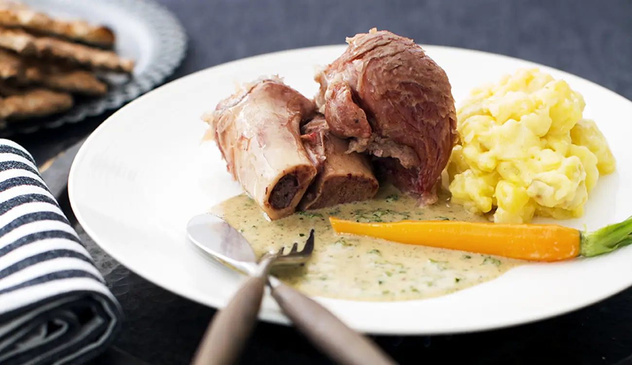 Kryddbräserad fläsklägg, potatisstomp och senapssky