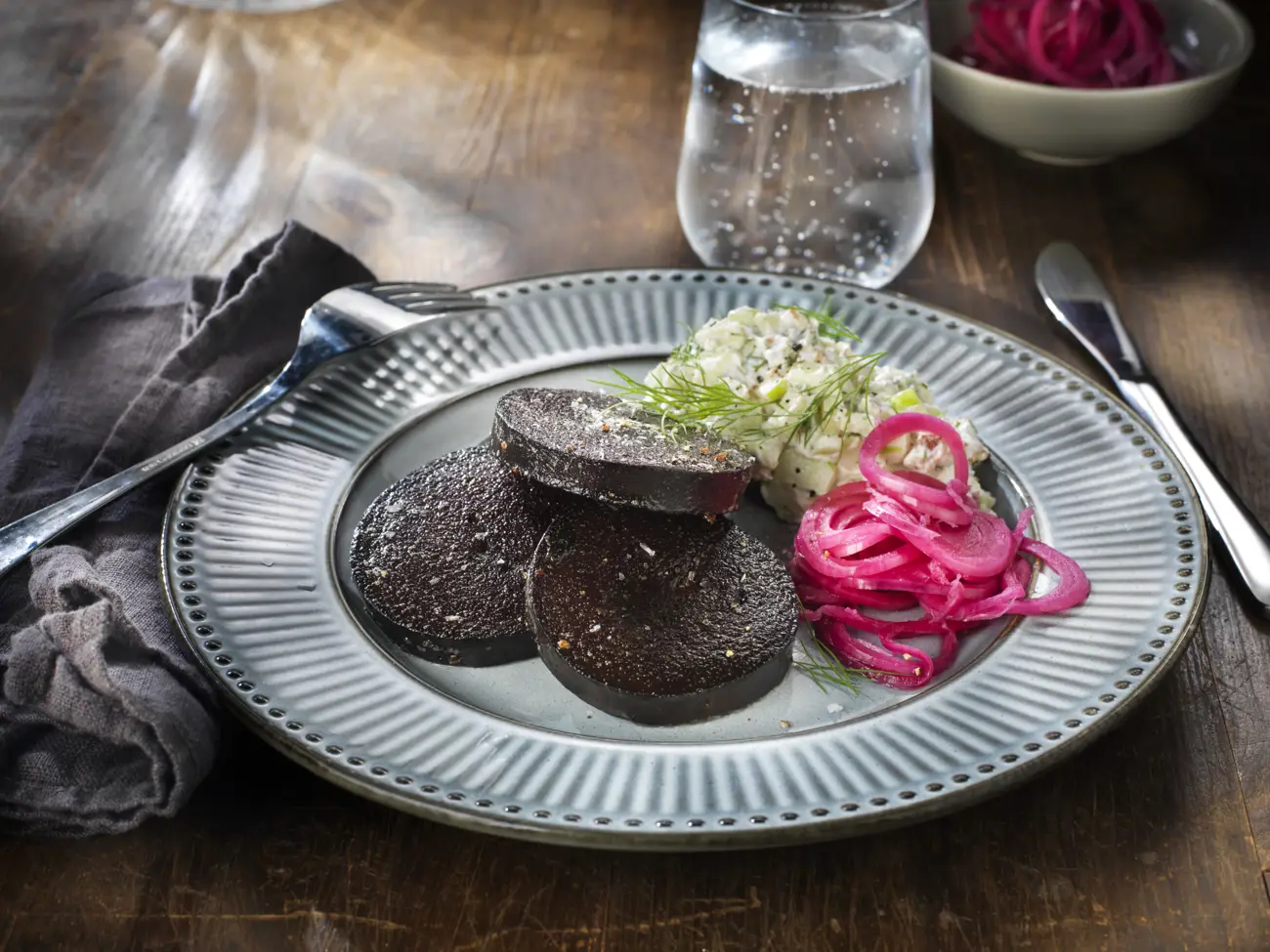 Lägg upp skivor av blodpudding tillsammans med en klick äppelröra och en sked av den picklade löken. Toppa gärna med extra dill eller pepparrot för färg och sting.