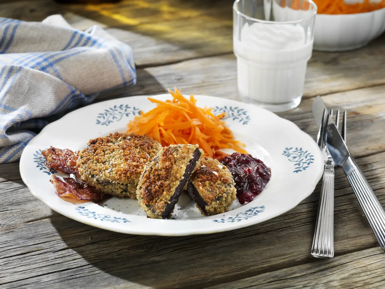 Skär blodpuddingen i cirka 1 cm tjocka skivor. Låt skivorna vila en stund i rumstemperatur – det minskar risken för att de spricker vid stekning. - Panera skivorna