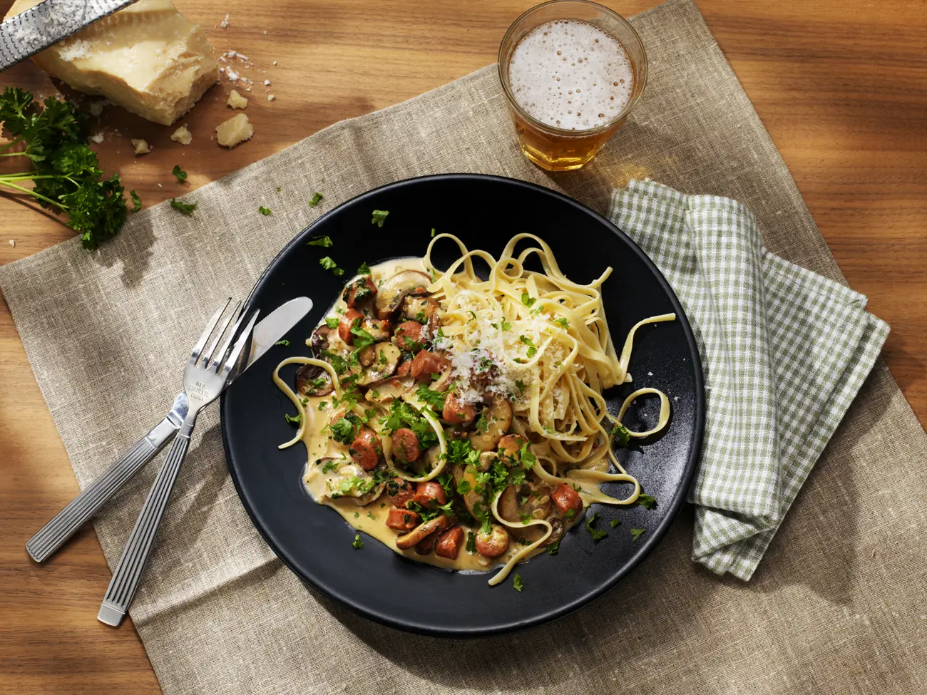 Tillsätt den stekta löken, svampen, vinet och grädden. Låt puttra i ca 12 minuter.