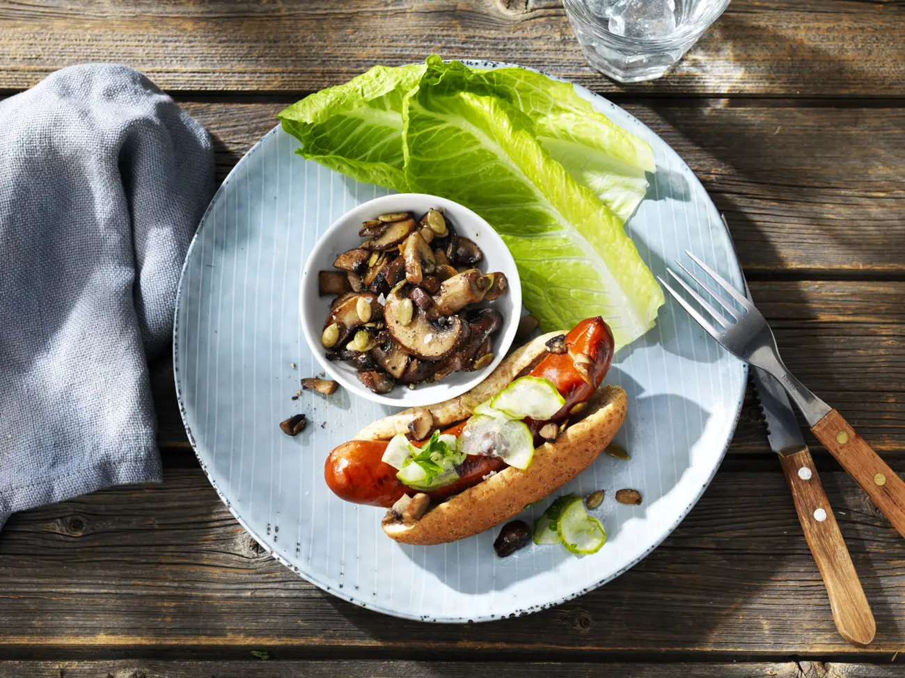 Grilla korvarna, lägg dem i fullkornsbröd och toppa med smörstekt svamp och inlagd gurka.