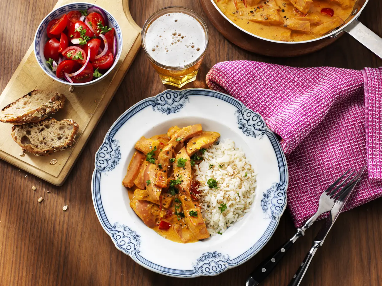 - Tillsätt tomatpuré och chilisås, späd med matlagningsgrädde och smaka av med curry, salt och peppar.