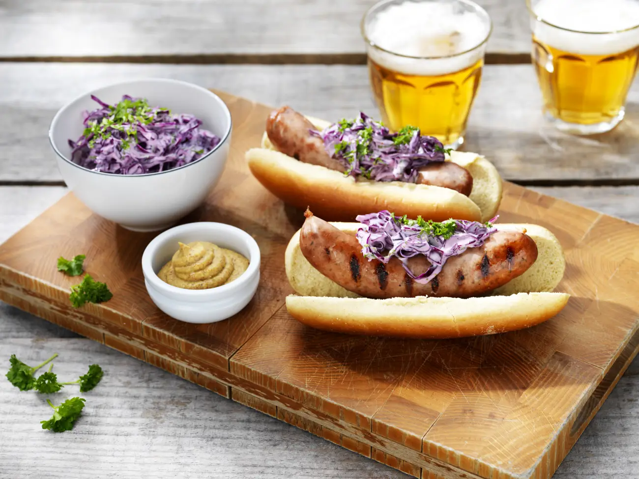Grilla korvarna och lägg dem i korvbröden. Toppa med rödkålsslaw och toppa med lite mer finskuren persilja. Om du önskar kan du servera grovkornig senap bredvid.