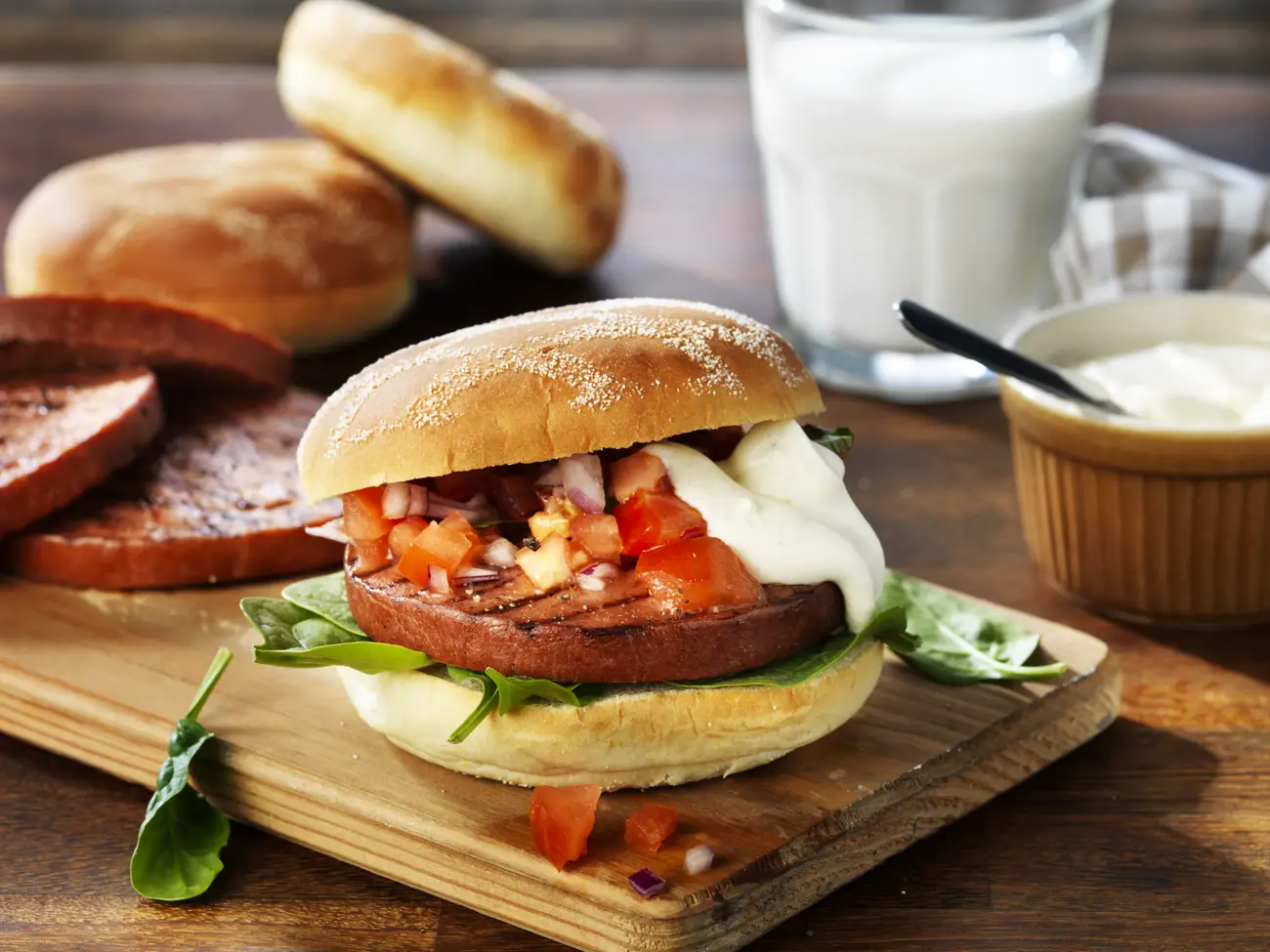 - Lägg spenatblad och parisare på hamburgerbrödet, toppa med salsa och dijoncrèmefraiche.