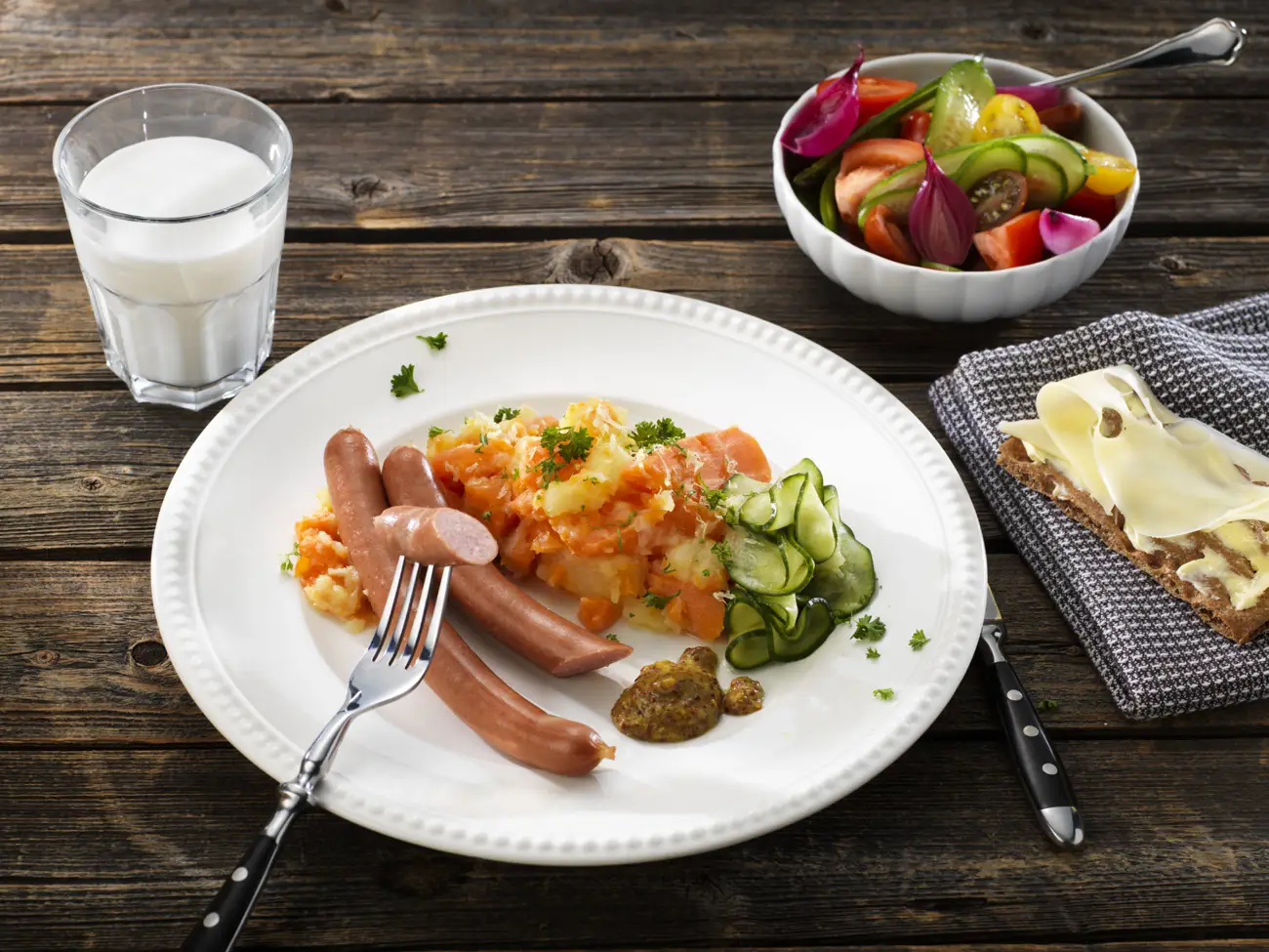 Krossa potatis och morötter med en gaffel eller stöt. Lägg upp rotfruktsmoset på en tallrik, strö över hackad persilja, det rivna citronskalet och riven parmesan. Servera med den kokta varmkorven och gärna en klick senap, lite inlagd gurka och en sallad.