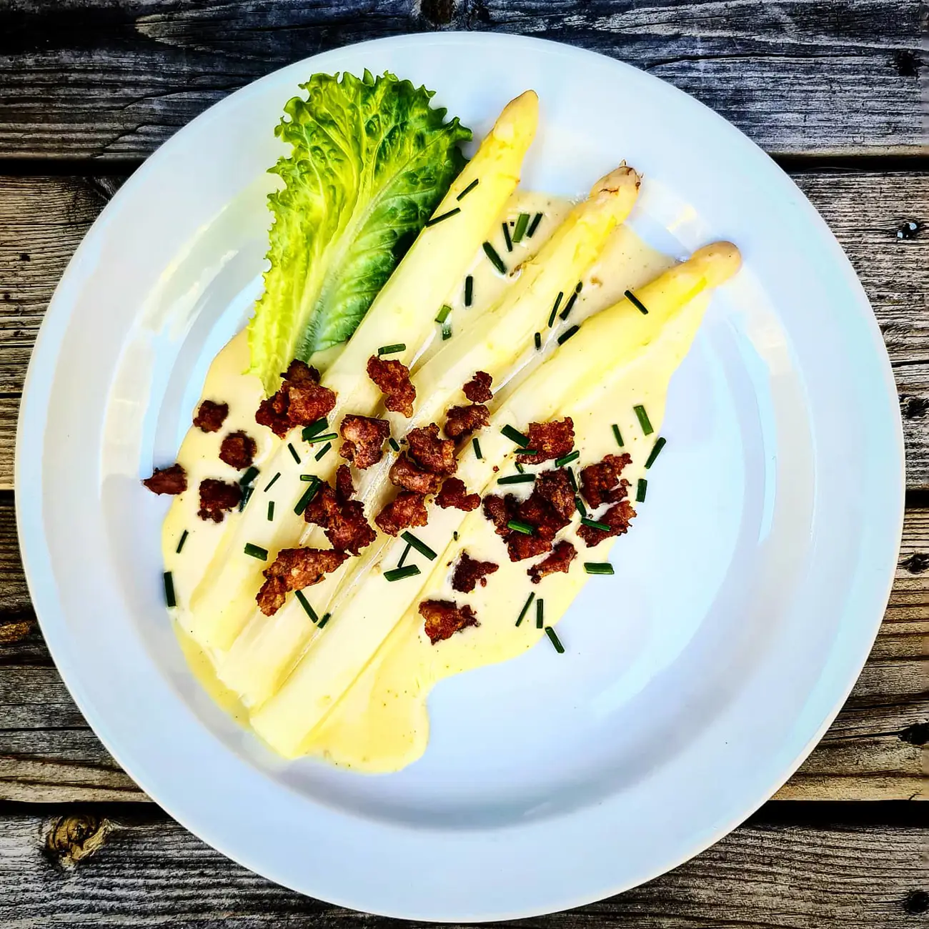 Vit sparris med mousselinesås toppat med färskkorv och gräslök