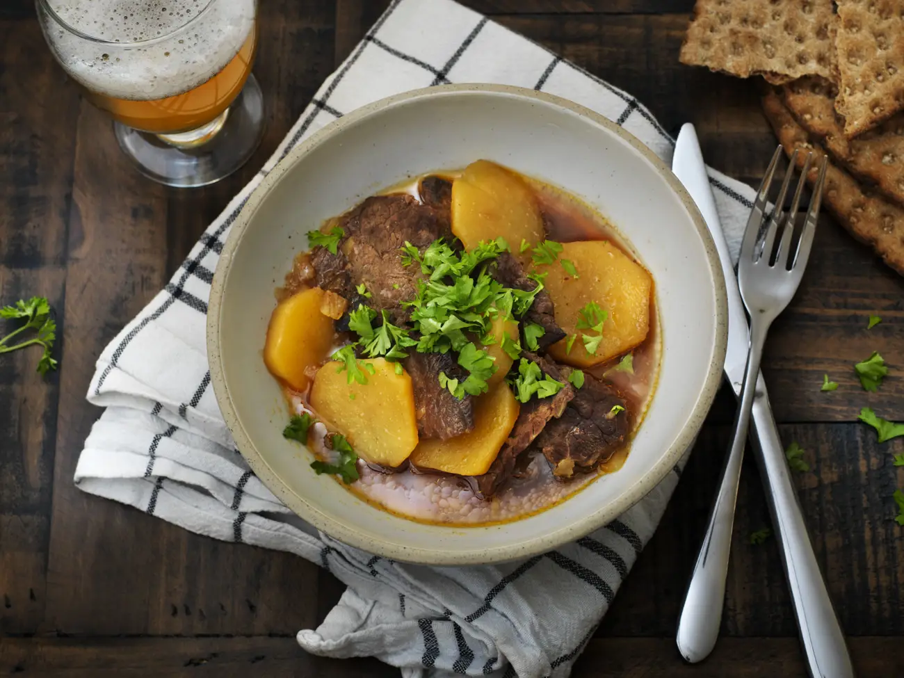 - Häll sedan på vatten, fond och öl. Låt puttra under lock i 45-60 min eller tills du känner att köttet är mört.
