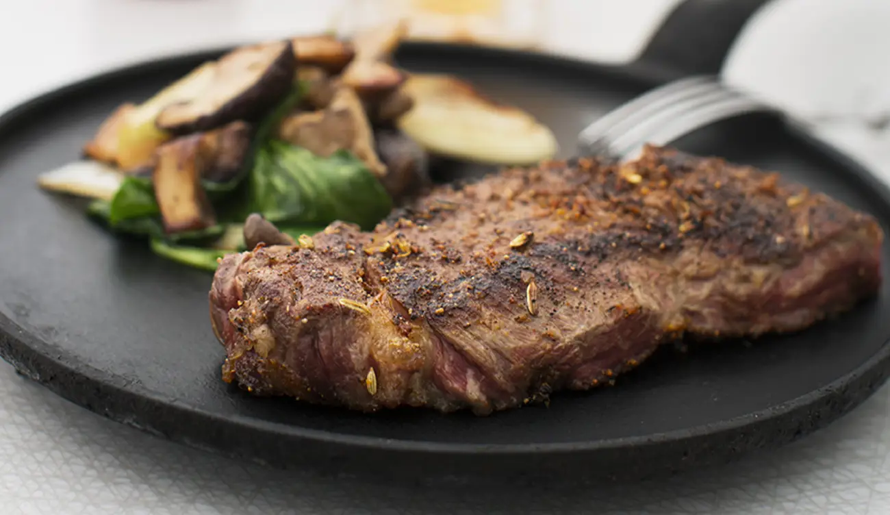 - Skär ryggbiffen i cirka 1 ½-2 cm tjocka skivor. Pensla med smält smör och klappa in kryddblandningen runt om. Hetta upp en stekpanna, gärna gjutjärn, tills den nästan börjar ryka. Lägg ner biffen i den torra stekpannan och stek cirka 2–3 minuter per sida. Vänd biffen några gånger under stekningen och låt gärna vila i folie några minuter innan servering.