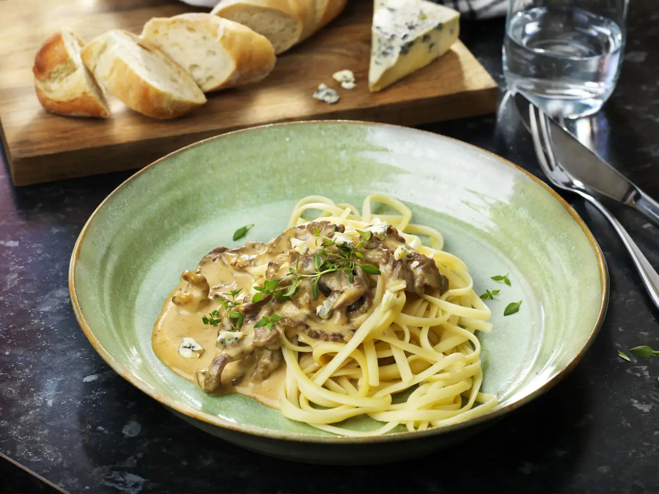 Strimlad lövbiff med ädelostsås och pasta