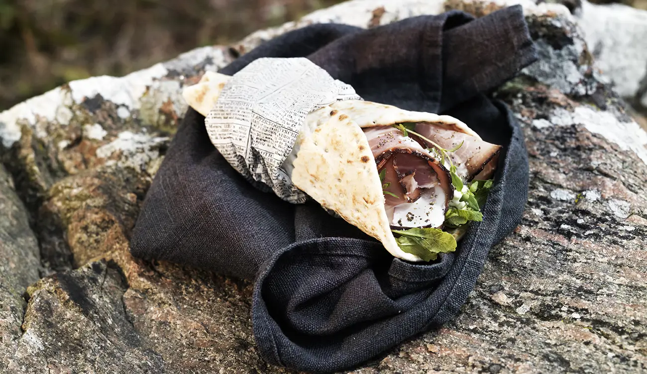 Alspånsrökt karré i tunnbrödsrulle med äpple och pepparrot