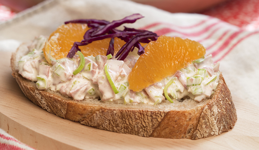 • Lägg skinkröra på ett gott bröd och garnera med strimlad rödkål och apelsinklyftor.