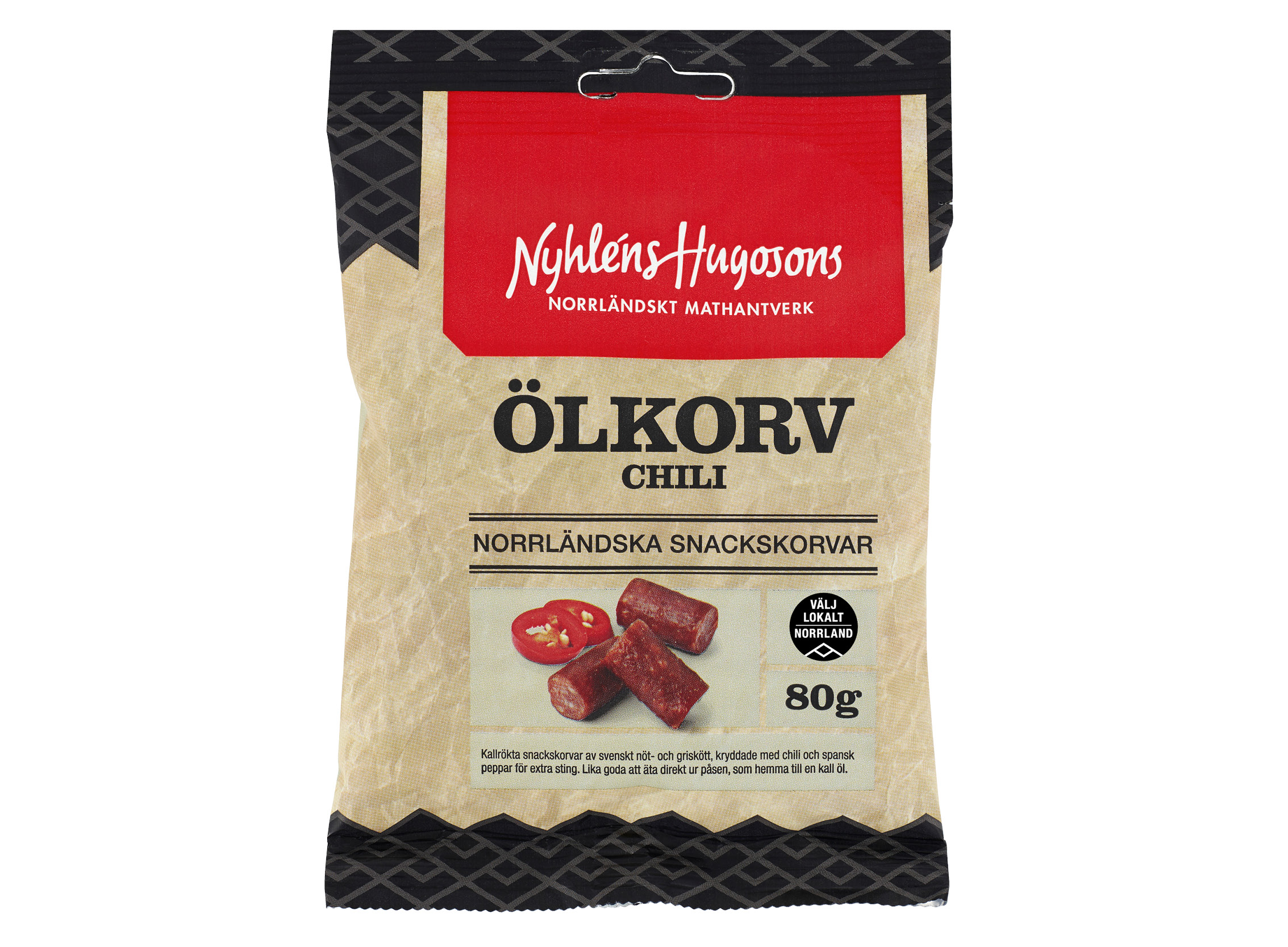 Kallrökt ölkorv med smak av chili. Kötthalt 173 g per 100 g.
