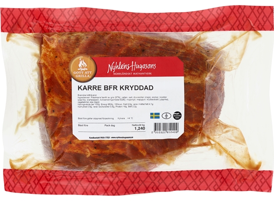 Marinerad karré, benfri av gris (87%), vatten, salt, druvsocker (majs), socker, kryddor (paprika, svartpeppar), majsmjöl, majsgryn, kryddextrakt (paprika), vegetabilisk olja (raps), jästextrakt.
