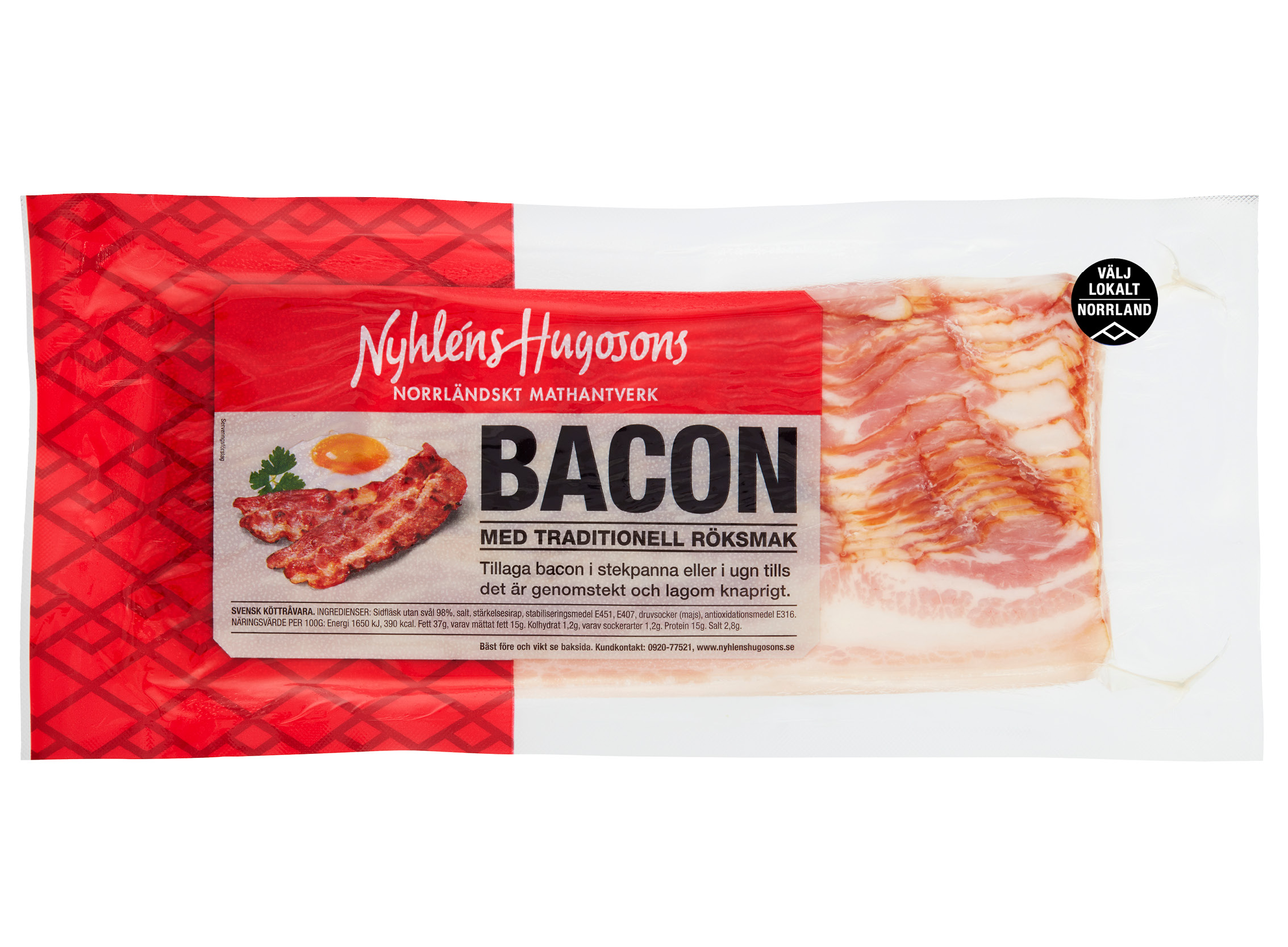 Sidfläsk utan svål 98%, salt, stärkelsesirap, stabiliseringsmedel E451, E407, druvsocker (majs), antioxidationsmedel E316, konserveringsmedel E250.