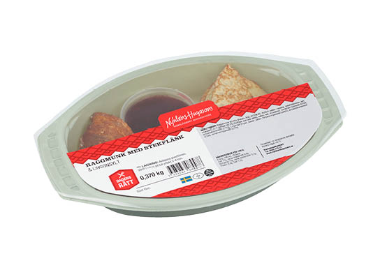 Raggmunkar (63.2%) [Potatis, ÄGG, VETEMJÖL, MJÖLK, vatten, rapsolja, potatisstärkelse, salt, vitpeppar], Stekt sidfläsk (26.3%) [Sidfläsk utan svål (90%), vatten, salt, druvsocker, konserveringsmedel (E250), antioxidationsmedel (E301)], Lingonsylt [lingon, socker, vatten, förtjockningsmedel (pektin), antioxidationsmedel (E330), konserveringsmedel (E202)].