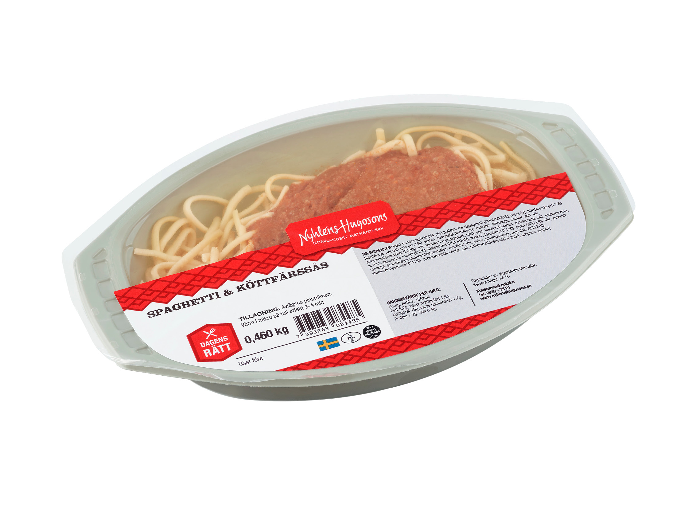 Kokt bandspagetti (54.3%) [Vatten, bandspagetti (DURUMVETE), rapsolja], Köttfärssås (45.7%) [Köttfärs av nöt och gris (41,1%), vatten, tomatsås (tomatpuré 83%, tomater 10%, solrosolja, socker,salt, lök 1,1%, antioxidationsmedel (E330)), lök, tomatpure (tomatpuré, salt) , salt, kalvfond (vatten, tomatpasta, salt, maltodextrin, surhetsreglerande medel (E325), jästextrakt (från KORN), socker, färgämne (E150), arom (SELLERI), lök, kalvkött 0,9%, rapsolja, grönsaksjuicekoncentrat (tomater, morötter, lök, vitlök, champinjoner, purjolök, SELLERI), stabiliseringsmedel (E415)), pressad vitlök ((95,5%), salt, antioxidationsmedel (E330)), oregano, timjan].