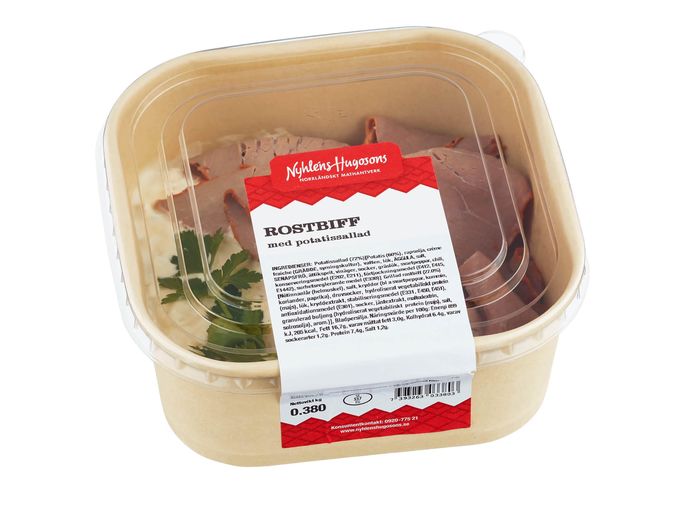 Potatissallad (72%)[Potatis (60%), rapsolja, crème fraiche (GRÄDDE, syrningskultur), vatten, lök, ÄGGULA, salt, SENAPSFRÖ, ättiksprit, vinäger, socker, gräslök, svartpeppar, chili, konserveringsmedel (E202, E211), förtjockningsmedel (E412, E415, E1442), surhetsreglerande medel (E330)] Grillad rostbiff (27.0%) [Nötinnanlår (helmuskel), salt, kryddor (bl a svartpeppar, kummin, koriander, paprika), druvsocker, hydroliserat vegetabiliskt protein (majs), lök, kryddextrakt, stabiliseringsmedel (E331, E450, E451), antioxidationsmedel (E301), socker, jästextrakt, maltodextrin, granulerad buljong (hydroliserat vegetabiliskt protein (majs), salt, solrosolja), arom.)], Bladpersilja.