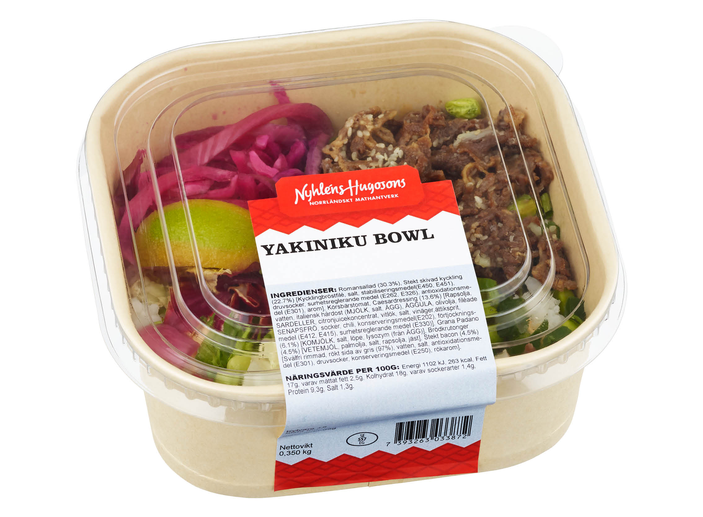 Kokt Sushiris (35,5%)[vatten, rundkornigt Sushiris, salt], Yakiniku (18.5%)[Fläskkarré, vatten, SOJAsås(vatten, SOJABÖNOR,