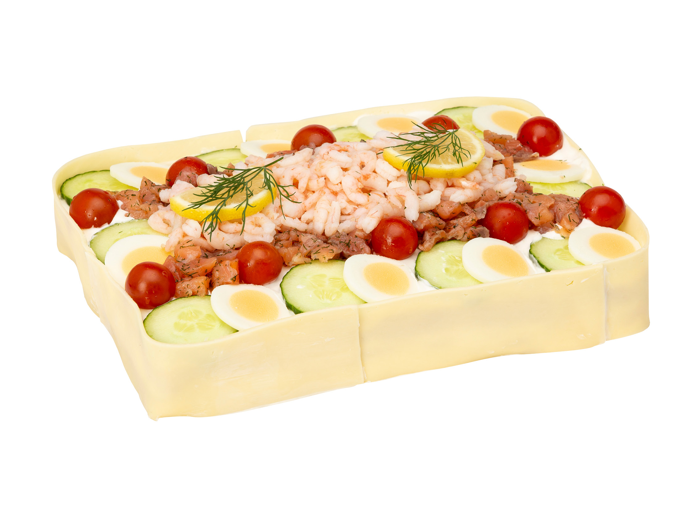 Skinkcreme (28.2%)[Rapsolja, skinka (29 %) (rökt skinka (25 %), vatten, salt, druvsocker, maltodextrin, kryddextrakt, konserveringsmedel (E250), stabiliseringsmedel (E451, E452), antioxidationsmedel (E301, E325)), vatten, ananas, gurka, socker, lök, ÄGGULA, ättiksprit, salt, vinäger, SENAPSfrö, modifierad stärkelse, chili, oregano, svartpeppar, paprika, konserveringsmedel (E202, E211), förtjockningsmedel (E415), surhetsreglerande medel (E330), färgämne (E101, E141)], Bröd[VETEMJÖL, vatten, SMÖR, socker, fullkornsmjöl av VETE, sirap, VETEGLUTEN, jäst, salt, dextros, stabiliseringsmedel (E412), emulgeringsmedel (E472 e), surdegspulver av VETE, vegetabilisk olja (raps), MALTMJÖL (VETE), enzym, MALTEXTRAKT (KORN), rapsolja, KORNMALTMJÖL, MALTMJÖL (KORN), Mjölbehandlingsmedel (E300)], Majonnäs [Rapsolja, vatten, ÄGGULA, socker, SENAPSFRÖ, ättiksprit, salt, vinäger, chili, konserveringsmedel (E202), förtjockningsmedel (E412, E415, E1442), färgämne (E160a)], Gravad LAX (9.4%) [(Salmo Salar), salt, socker, dill], Räkor (7.5%) [RÄKOR, vatten, salt, antioxidationsmedel (E330), konserveringsmedel (E211, E202)], Körsbärstomat, Gurka, Ost [Pastöriserad MJÖLK, salt, ostlöpe, syrningskultur], Ägg [ÄGG (98%), modifierad stärkelse, salt, surhetsreglerande medel (E330)] Citron, Dill.