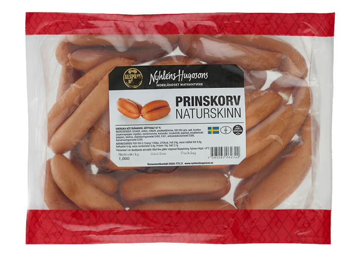 Prinskorv var tidigare en namnskyddad charkprodukt. Trots att särartskyddet nu endast gäller falukorv, har vi på Nyhléns Hugosons ändå valt att följa de tidigare rekommenderade reglerna för tillverkning av prinskorv.