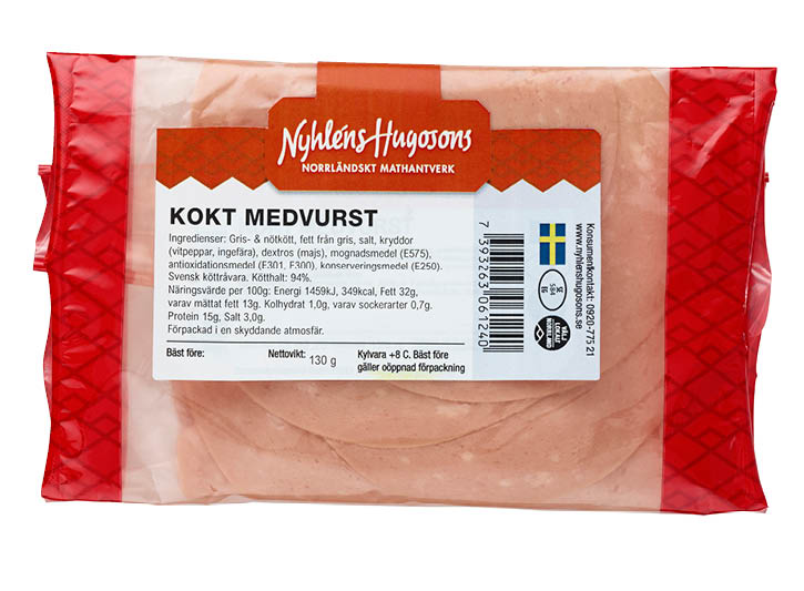 Kokt medvurst som tillverks av nöt och gris från